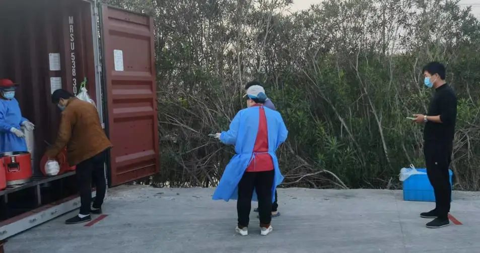高東鎮城管中隊在港繡路199號現場勘察,在不影響道路通暢和行人通行的地方選址,高東鎮物流協會協助安排,將一個空置的集裝箱作為盒飯供應場地。工作人員嚴格按照防疫要求,在地上用漆劃出了2米間隔標線,并拉起輔助排隊的隔離繩減少接觸,避免交叉感染風險。
