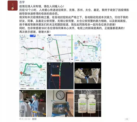 “疫情無情人間有情……”收到藥后,陳先生在朋友圈內滿懷感激之情地寫下一長段話。整整12個小時的接力,陳先生一直在手機上守著。為方便聯系,陳先生組了一個群,所有參與接力的人員接到藥后都會在群里告知進展。陳先生說,每個參與接力的朋友和民警都要從原來的地方出發、接到后送出、再回去,里程和時間都是翻倍的,加起來足有700多公里,每一個人的付出他和母親深深地銘記在心。