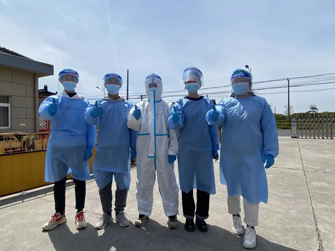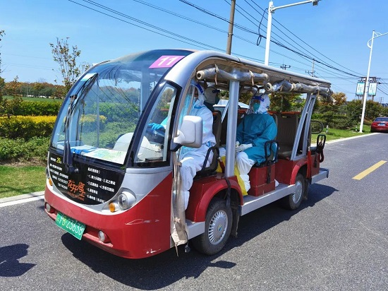 在朱涇鎮待涇村,一輛輛紅色景區觀光車化身為“防疫專車”由花開海上生態園的員工駕駛,帶著醫護人員和村民志愿者,穿梭在村域內的各組村埭。