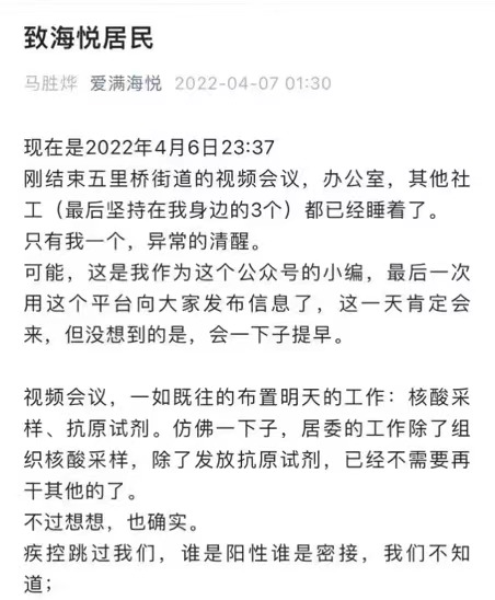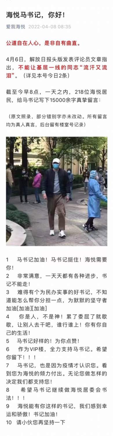 4月7日凌晨,“致海悅居民”一文發出后,迅速成為“10萬+”,網上轉瘋了。馬勝燁完全沒想到,一度覺得自己“完了”,“我心想,我給街道惹了個大麻煩!