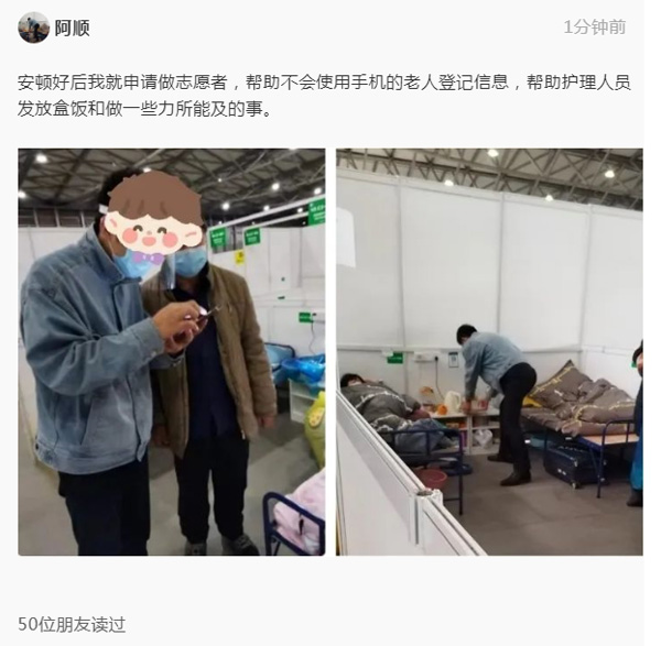 于是,我就主動就地申請做方艙志愿者。在工作人員的安排下,我戴好口罩和防護面罩正式上崗,主要幫助不會使用手機的老人登記信息、幫助護理人員發放盒飯,還有做些力所能及的事情。