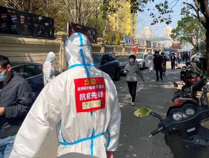 近段時間以來,工作在金橋開發區三個片區內的員工驚喜地發現穿梭忙碌在園區里、各個企業間的“大白”們添加了新標識——白藍相映的防護服上貼有鮮明、跳動的紅色“抗疫先鋒”標識。這支由金橋開發區綜合黨委號召、組建的,以黨員、積極分子為主體的588名的“逆行人”,身披“抗疫先鋒”戰袍,迎難而上、奔走在開發區每一個需要他們的角落,沖鋒陷陣,為開發區筑起了一道抗疫的堅固屏障。