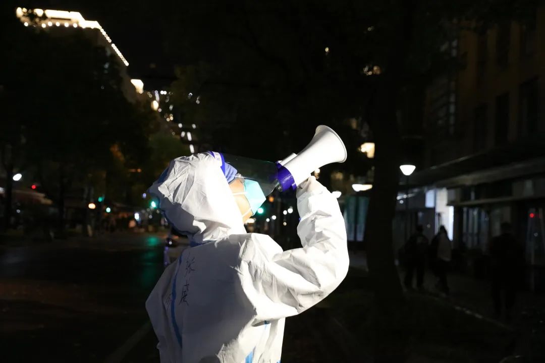 喉嚨有些沙啞,仰脖呼號的正是五角場街道市場監督管理所的張威。為了避免人群聚集交叉感染,他手持小喇叭沿著大學路,請一棟棟樓的居民下樓進行核酸采樣。