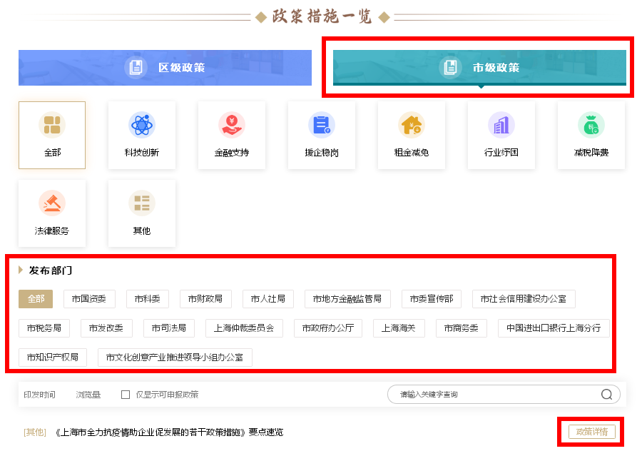 “助企紓困”專欄設置了“政策措施一覽”欄目,匯聚了市區兩級相關部門最新出臺的關于資金扶持、財政補貼、援企穩崗、租金減免、行業紓困、金融支持、減稅降費、科技創新、人才服務、法律服務、融資需求、產品供需等多方面的各類“助企紓困”政策和服務措施,并根據不同政策和服務措施內容配置了“政策詳情”、“立即辦理”等功能。