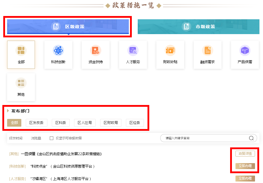 同時“助企紓困”專欄也匯聚了“金山企業服務云”、“科技點金”(金山區科技資源管理平臺)、“才耀灣區”(上海灣區人才服務平臺)、“一網暢融”(金山區中小企業融資綜合信用服務平臺)等本區自有特色企業服務平臺相關服務功能,方便企業集中查找相關適配政策和服務措施、幫助企業線上申請辦理相關政策和服務事項。