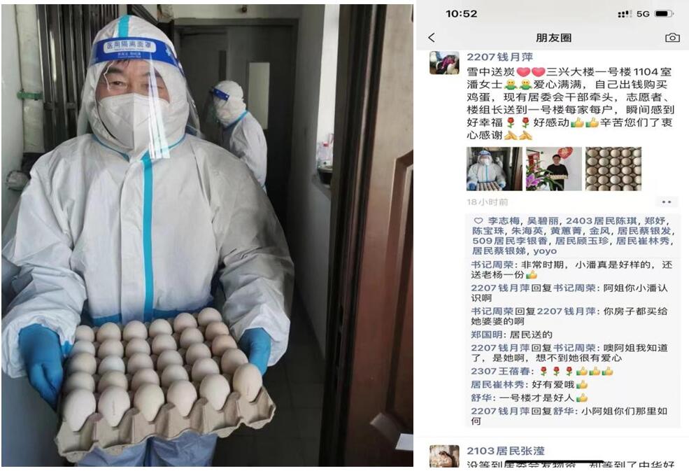 在居委會干部張莉莉和志愿者蔡銀發、孫我平的協助下,7200枚雞蛋被一一分送到1號樓各居民家中,居民們都感受到了這份暖意,對大都數的居民來說,他們根本都不認識這位素未謀面的鄰居潘天枝。