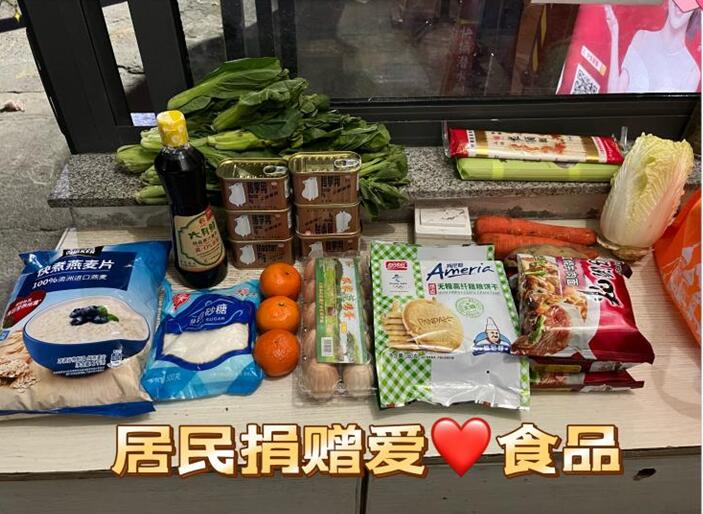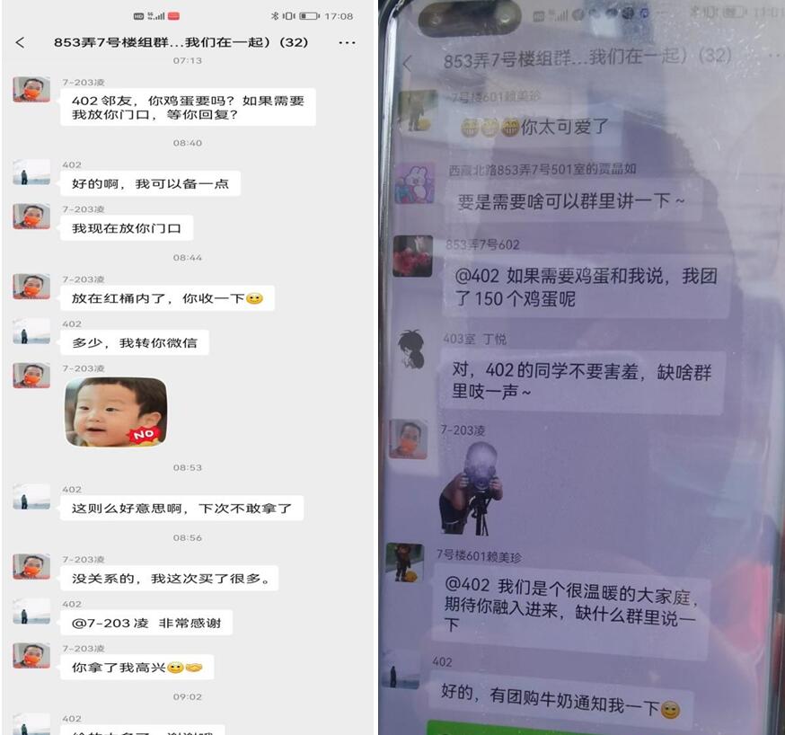 “你方便到樓下3樓來取嗎?我們家還有2包掛面”“我是樓下403的,我放了一包600克掛面在門口,你一起取一下”“我們家還有幾包泡面,我給你拿4包”“202給一小袋黑米、香腸、裙帶菜,一起帶走”……與此同時,樓組群里的其他居民也看到了這條消息,樓組長沈于珍、沈紅珍、王俊、顧菊鳳、獨居老人馬芝鳳、殘疾人陳靜飛等迅速做出反應,勻出自家的罐頭、麥片、雞蛋水果、糕點甚至調味料等并不富裕的物資。