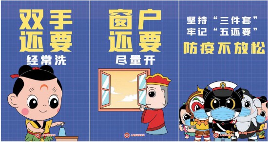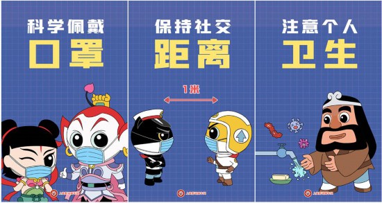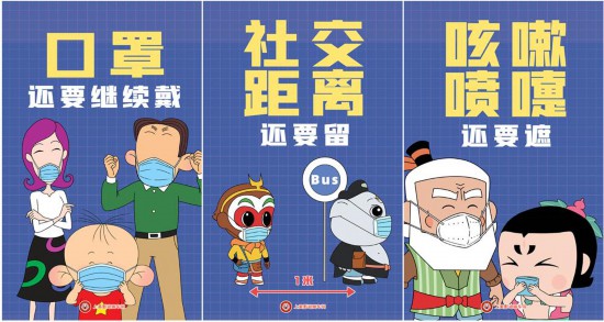 在一代又一代人的童年里,快樂的時候,他們是好朋友;孤單的時候,他們是好伙伴;害怕的時候,他們是保護神;顫娭彼哪倪、正義勇敢的黑貓警長、頑皮善良的大耳朵圖圖、機智可愛的蛋生等上美影動畫IP還出現在宣傳海報上助力防疫,以生動形象的方式宣傳“三件套”“五還要”:科學佩戴口罩、保持社交距離、注意個人衛生;口罩還要戴、社交距離還要留、咳嗽噴嚏還要遮、雙手還要經常洗、窗戶還要盡量開。