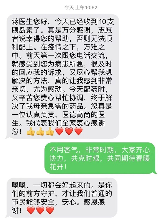 “蔣醫生您好,今天已經收到10支胰島素了,真是萬分感謝......”近日,復旦大學附屬金山醫院門診辦公室主任蔣志宇收到了一位居民發來的感謝短信。