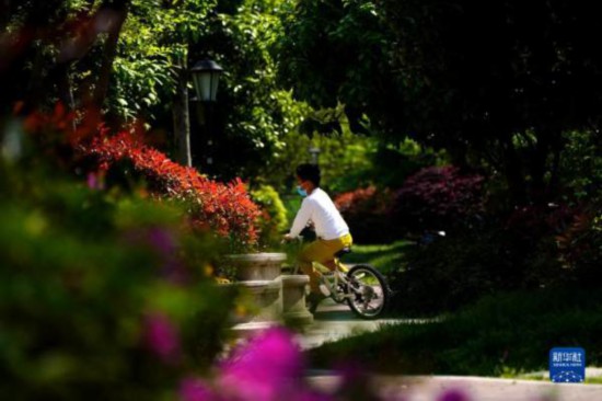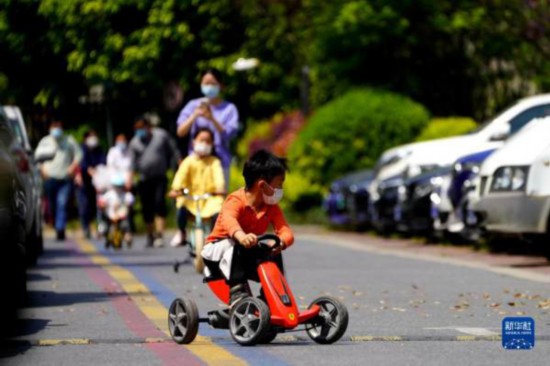 4月12日,在上海松江區洞涇鎮被列入防范區的一個小區內,一名孩子在騎車玩耍。