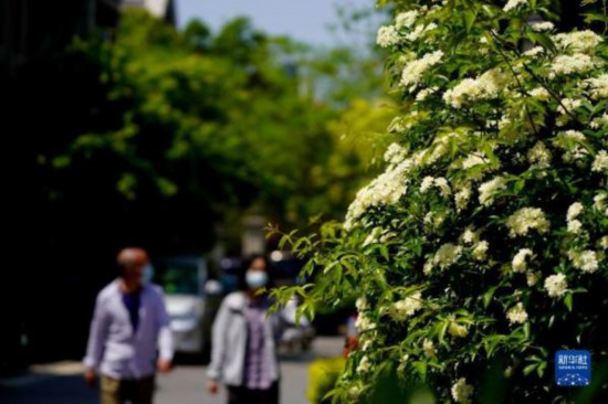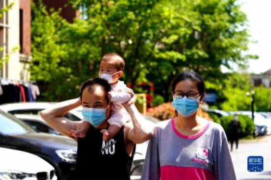 4月12日,在上海松江區洞涇鎮被列入防范區的一個小區內,居民在散步。