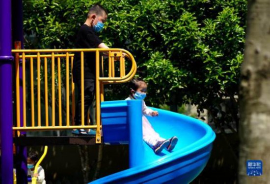 4月12日,在上海松江區洞涇鎮被列入防范區的一個小區內,孩子在玩耍。