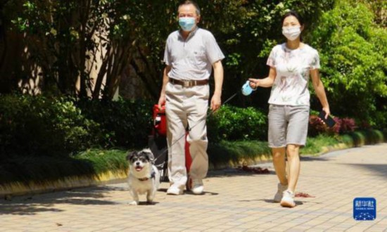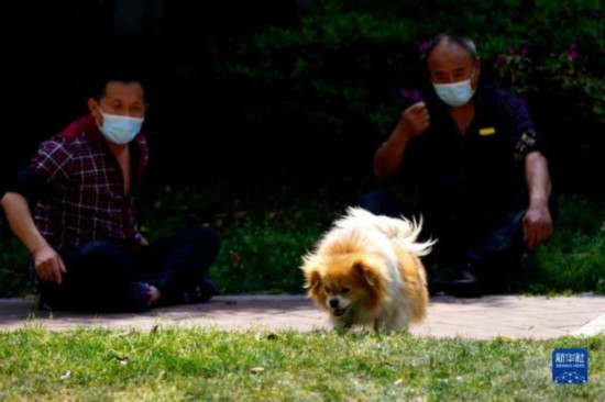 4月12日,在上海市嘉定區南翔鎮被列為防范區的一個小區內,居民在遛狗。