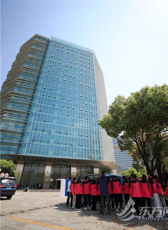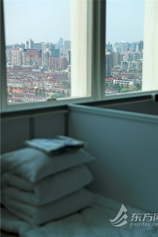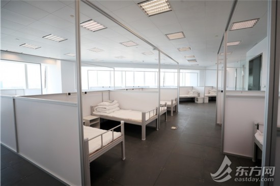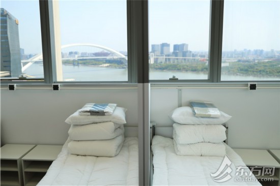 4月12日中午,東方網記者來到綠地瀛通大廈看到,寫字樓原本寬敞明亮的辦公區內,已經整齊擺放好床鋪,床單、被子、枕頭都齊備。最讓人印象深刻的是一面面落地窗,綠地瀛通大廈到江邊只有330米直線距離,能夠無死角地瀏覽浦江風光,遠眺浦東世博片區。