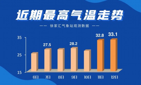 東方網記者包永婷4月12日報道:33.1℃!繼昨天(11日)上海最高氣溫32.8℃后,今天(12日)徐家匯站最高氣溫創下今年新高,同時也成為徐家匯站建站150年以來4月中旬同期第二高位。