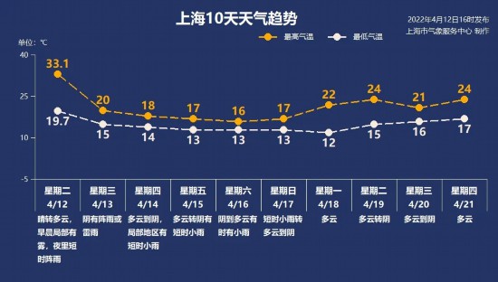氣溫方面,13日下午到傍晚起,上海受冷空氣影響,溫度明顯下降,24小時日最高氣溫下降幅度可達12℃以上,13日最高氣溫20℃左右。