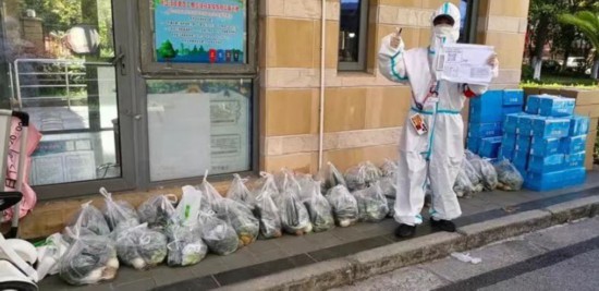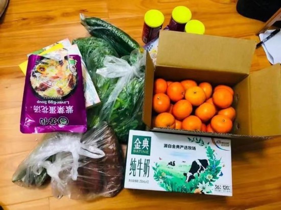 王婷婷家住浦東張江某小區,這幾天一直在為居民買菜,提供米、面、油、糧等基礎物資。