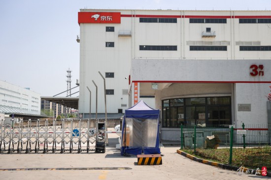 記者拍攝期間,僅看到興邦路邊?恐v京東物流貨車,園區大門緊閉,未看到有貨車和人員進出。