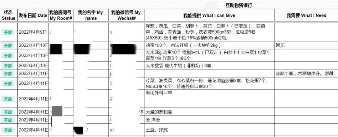 打開晶采名人公寓“物資銀行”的供需清單,仿佛進入了一家“在線超市”。清單上列出了居民可以提供或當下所需的物品,發布時間及每一位發布者的姓名、房間號、微信號也都標注得清清楚楚。這些物資不售賣,而是無償提供給有需要的鄰居們。