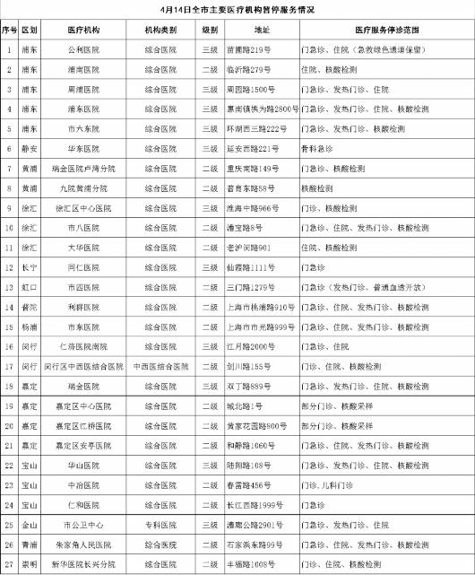 4月14日上海市、區主要醫療機構暫停醫療服務情況一覽