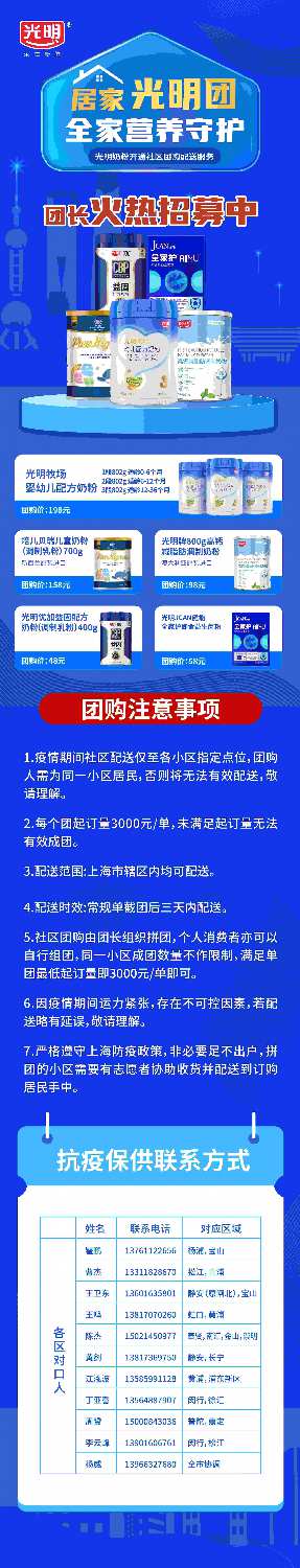 光明乳業還介紹,目前光明常溫牛奶、光明奶粉、光明冷飲、牛奶棚等產品可分區由指定人員對接社區團購。