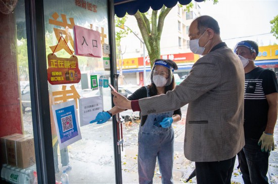 在已開放的好又多超市,志愿者們協助超市工作人員落實掃場所碼,嚴格落實“一戴三查”,并一一檢查購買人員的出入證,憑證進入超市!熬用衽笥褌,請戴好口罩,保持2米距離,提前出示出入證,亮出核酸陰性證明、行程碼,打開微信、支付寶或隨申辦app掃‘場所碼’進入超市…… ”喇叭里不間斷地播放著,提醒村居民注意好相關事項。