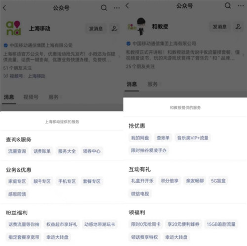 “上海移動”和“和教授”是上海移動直接運營的兩大公眾號,均可提供用戶賬單查詢、優惠活動信息以及福利發放服務。其中,上海移動官方公眾號主打優惠活動搶先發布,此外還提供流量話費一鍵查詢、優惠業務快捷辦理以及免費權益領取服務;和教授公眾號則不僅“教”流量“授”套餐,還會定期發布咪咕視頻、咪咕閱讀、咪咕快游、咪咕音樂等方面的一手福利。關注這兩大公眾號,福利多多,話費賬單一手掌握,還有流量禮品定期送,是薅上海移動羊毛的一線陣地,在微信分別搜索“上海移動”和“和教授”即可關注。
