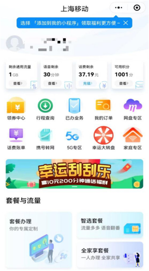 人在微信,最快捷的流量賬單查詢方式莫過于通過上海移動小程序,收藏后在微信對話頁下拉進入小程序頁面,點擊進入上海移動小程序后,就可以看到井然有序、令人感到極度舒適的用戶個人信息頁面啦!流量、語音、話費、積分剩余量一目了然,還集合了領券中心、行程碼、幸運大轉盤等高頻應用,絕對是“戳中痛點”的存在,可以拯救一些小伙伴“券到用時方恨少”、“碼到用時找不到”的尷尬處境。