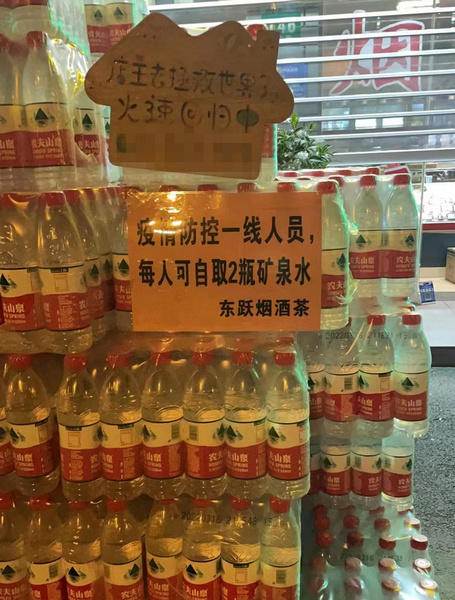 泗涇鎮全域靜態管理以來,泗磚路上一家煙酒店門口總是堆著成山的礦泉水,你總不見它變少,上面一張紅色提示紙格外醒目“疫情防控一線人員,每人可自取2瓶礦泉水!
