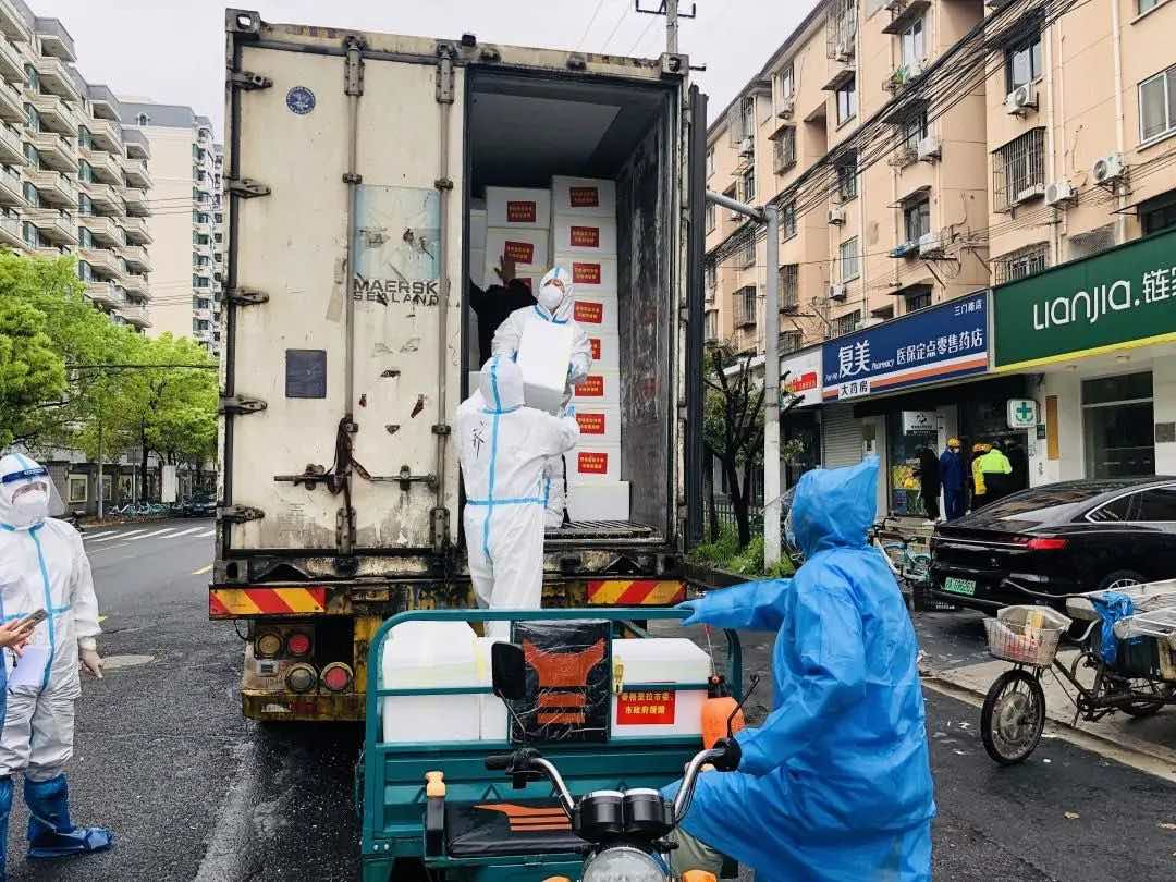 下午,兩輛從云南香格里拉開來的冷鏈運輸大卡車,分別抵達控江路街道和五角場街道物資接收點。在五角場街道三門路358弄小區門口,志愿者們有序卸貨,采取接力的方式,把一箱箱生活物資大禮包搬上轉運車,然后再由轉運車運送至小區內。