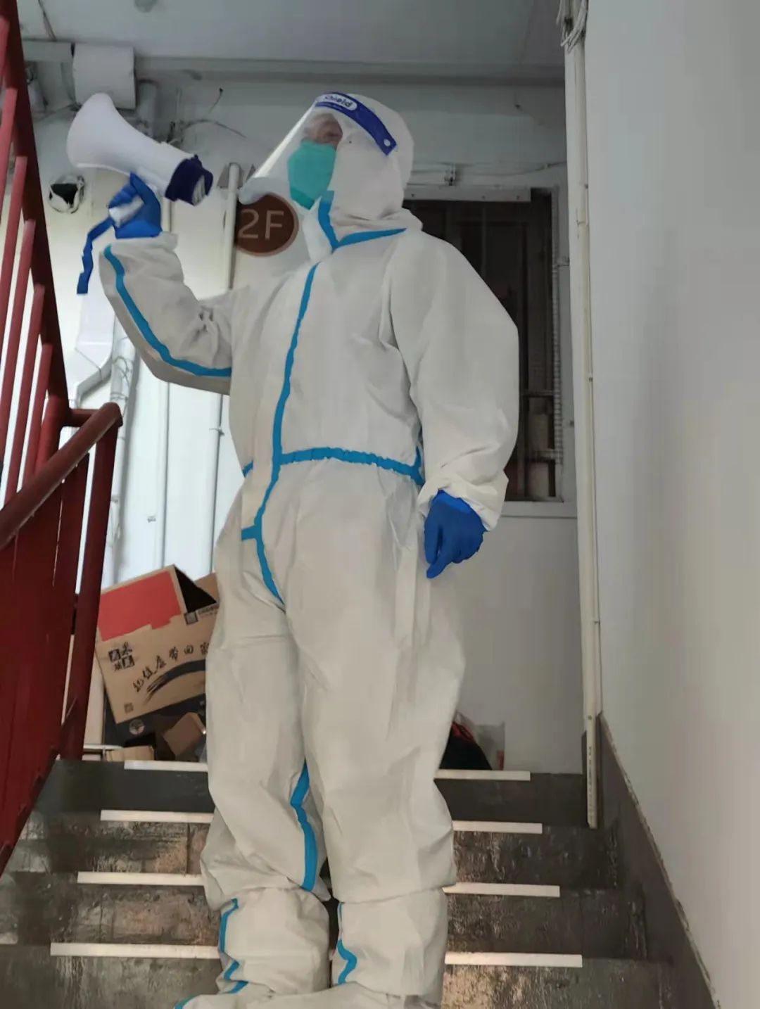 一天下午,廣中路街道一小區封控樓道內響起了喇叭聲,一位身背噴灑箱的“大白”進入樓道,對各個樓層逐一噴灑藥水消毒。