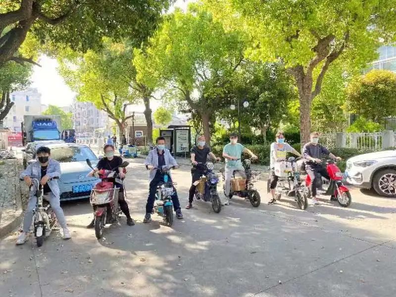 封控之后,社區居民團購也開始多起來。米、面、油、大包的蔬菜送到百姓家里,單靠志愿者手動肩扛肯定不行。在盈湖三島有一群愛心“騎手”,由小區里的居民自發組成,他們每天騎著小電驢穿梭在小區里,將居民所需及時送到家里。