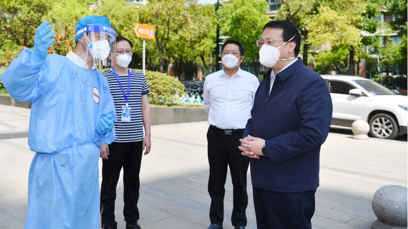 4月12日,龔正在普陀區富平路一小區現場察看分區分級管控實施后的社區疫情防控措施,詢問居民生活物資保供、特殊人群服務等情況,走訪社區周邊的藥房、超市,了解外賣、快遞等流動崗位人員防疫措施落實情況。