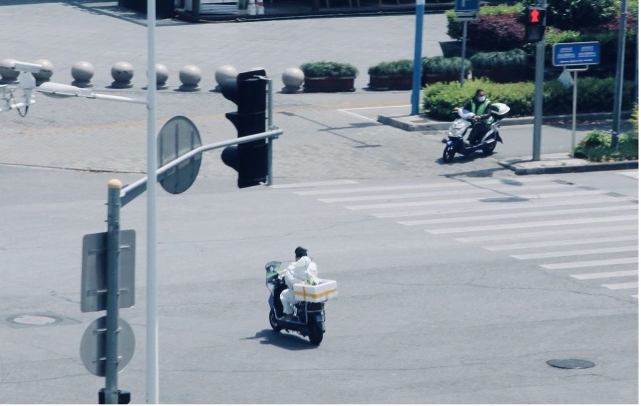 上海街頭送生活物資的快遞小哥。馬作鵬攝