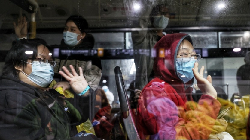 4月14日,一輛輛坐滿乘客的公交車駛出國家會展中心(上海)方艙醫院,這個大型方艙的首批322名解除集中隔離醫學觀察的市民出艙回家。
