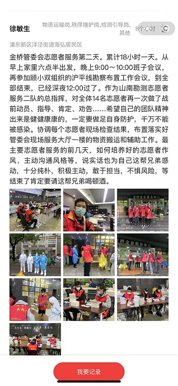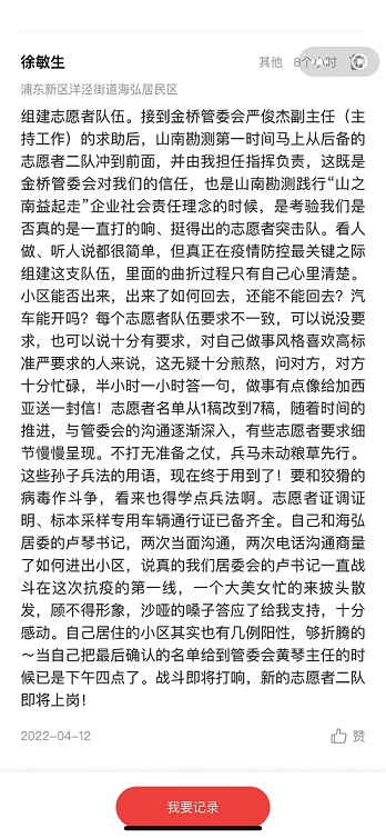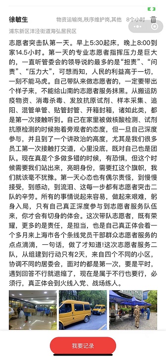 “第一天帶隊壓力很大,怕做不好給山南丟臉。從搬運防疫物資、消毒殺毒、發放抗原試劑、樣本采集、追陽、混管單管、貼管封管、開箱封箱,諸如此類,都是第一次接觸。自己在家里被做核酸檢測、試劑抗原檢測的時候抱著旁觀者的態度。第一天的心態從偶爾責怪,到慢慢接受,到感動,到流淚,志愿者服務隊員每一個都盡心盡力、無怨無悔,每一位都是好樣的!躬身入局,真正具體、深度參與志愿者服務后,才會對抗疫的辛苦與忙碌有了切身的體會。非常時期的帶隊出征,既有榮耀,也是責任和擔當,更是使自己深切體會到一個多月來上海各個條線、各個層面的醫務人員、黨員、干部及志愿者非比尋常的艱辛和付出!幾乎所有的自貿區管理局工作人員都是通宵達旦的工作,許多人已在辦公室住了一個多月。封控期間、非常時刻的上海,盡管大家都很艱難,但許許多多處于防疫抗疫一線的人更難、更累、更不容易!苯洑v了14個小時連軸轉的志愿者工作后,徐敏生寫下了第一天的抗疫日記。