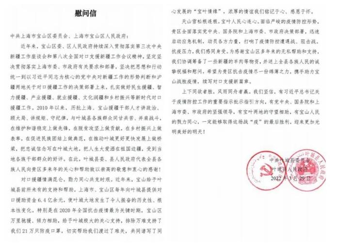 自2010年上海對口支援新疆喀什地區以來,上海寶山區一直對口支援葉城縣。當前,上海正面臨著前所未有的疫情大考,始終牽動著葉城縣各族人民的心。自上海本輪疫情發生以來,葉城縣委、縣政府高度重視、立即響應,迅速召開專題會議進行安排部署,要求弘揚“一方有難八方支援”的互助精神,全力支援上?箵粢咔。同時,縣委、縣政府第一時間向上海市寶山區發送《慰問信》,為上?箵粢咔榧佑椭。