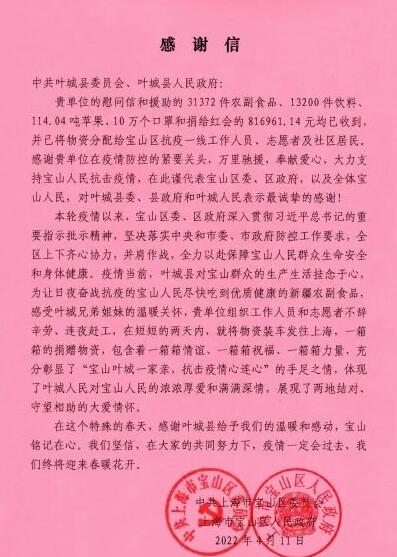 近日,上海市寶山區一線抗疫人員和社區志愿者等已陸續收到來自葉城的保障物資,并致來《感謝信》,對葉城縣委、縣政府和葉城人民表示最誠摯的感謝,充分彰顯了寶山葉城一家親、抗擊疫情心連心的手足之情。