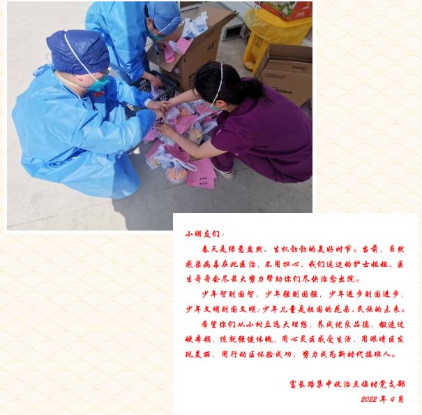 臨近中飯時間,富長路集中收治點36位小朋友收到了一封慰問信、一盒牛奶、兩包堅果、兩份水果,小朋友們喜出望外,連聲道謝,一片歡聲笑語。這是在富長路集中收治點臨時黨支部倡議下,全體醫護人員自發籌集分發給13歲以下小朋友的一份特殊的禮物?粗∨笥褌凅@喜的神情,聽著一聲聲“謝謝”,全體醫護人員疲憊的身體充滿了電,其他患者也紛紛點贊。