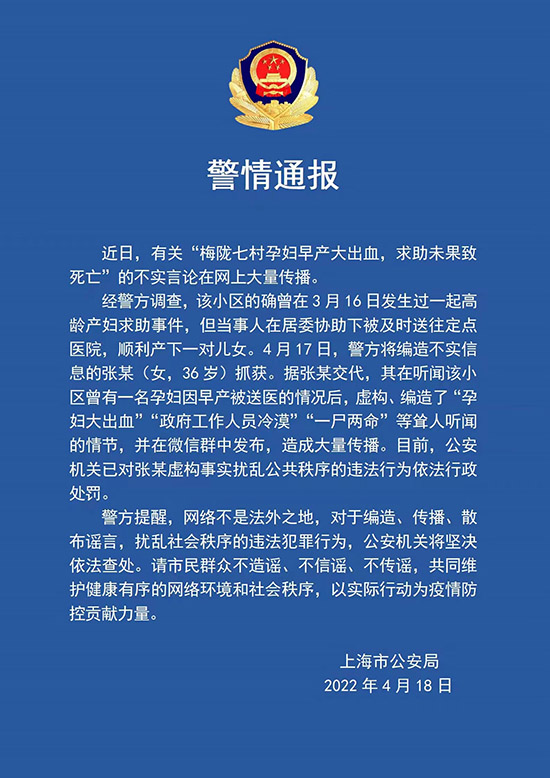 人民網上海4月18日電 (王文娟)據上海市公安局通報,近日,有關“梅隴七村孕婦早產大出血,求助未果致死亡”的不實言論在網上大量傳播。