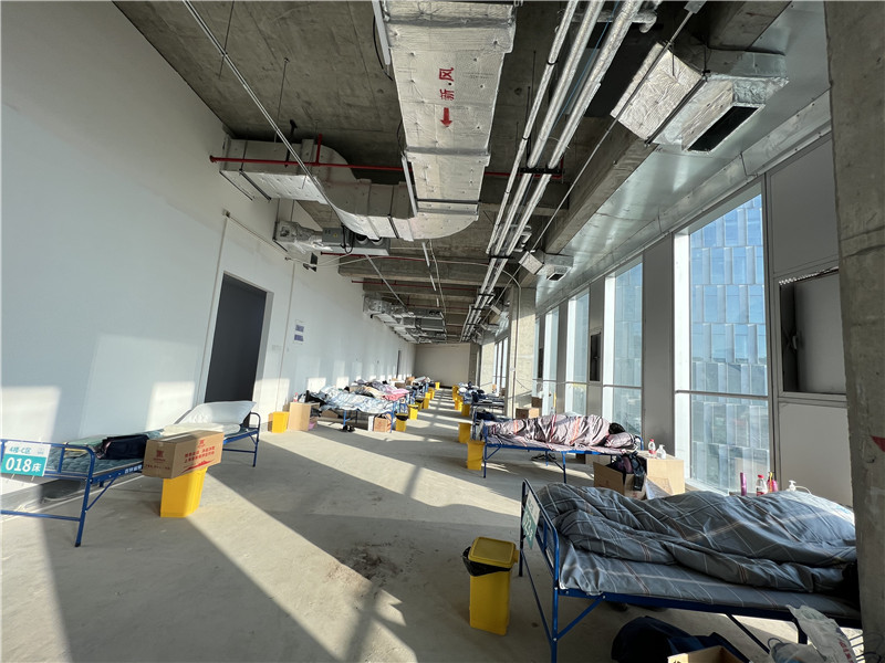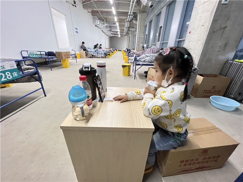 4月16日下午,我們一家三口搬進了位于方艙四樓的家庭房。動手能力極強的娃爸將三張單人床拼湊在一起,組成一張寬約2.7米的“豪華大床”。搬進來只一晚,我就體驗到了家庭房的可貴。