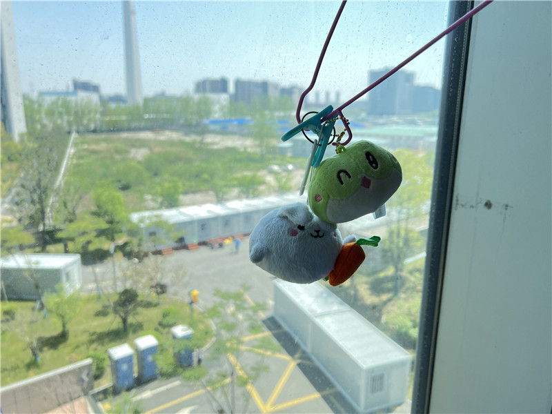 娃趴在窗戶邊,拿著小玩偶向樓下眺望。我打開手機拍照頁面,將樓下集裝箱房上的字無限放大,終于看清楚了:宿舍?!皨寢?,誰住在宿舍里面?”“大白叔叔還有大白阿姨住在那里。他們好辛苦,為了照顧我們都不能回家?!蓖蕹了计?,將她最喜歡的玩偶掛在窗戶上,“媽媽,我把我的寶貝給他們看,他們會不會開心一點?”“那當然啦!”被肯定的娃開心得手舞足蹈。