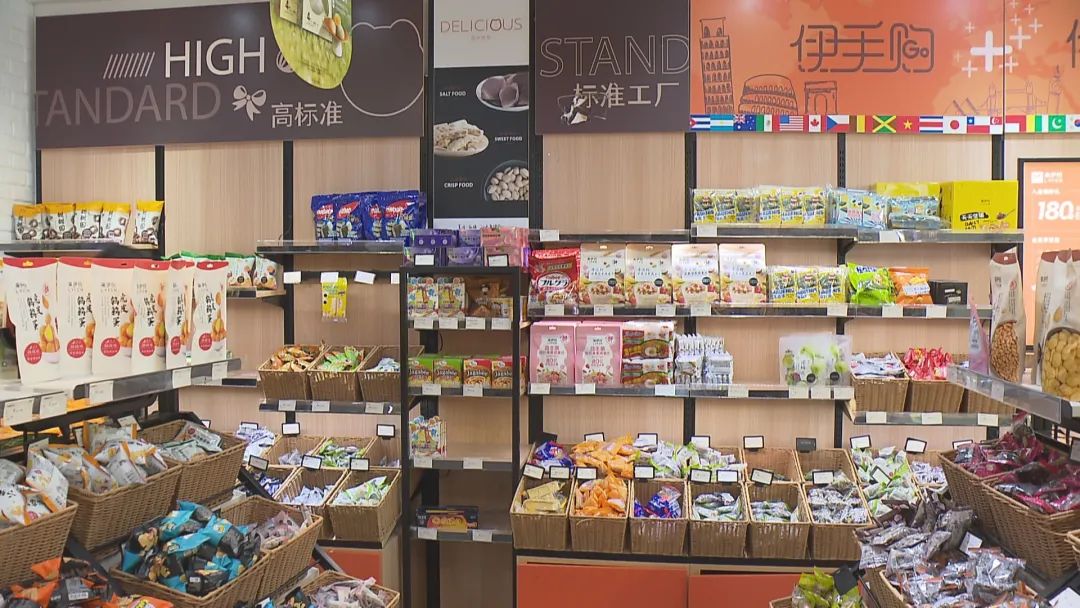 市民:這里小孩吃的東西比較多,買點蠻好的。超市里要排隊不太方便,現在這里剛開,人也少,東西也多。