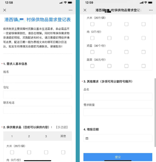 線上,建立專用微信群及時收集最新需求信息,并巧妙運用“問卷星”小程序統計物資需求數量,自動生成匯總物資需求清單,大大提升供需對接效率。線下,各村明確保供專員,公布保供熱線,全天候為群眾提供接單服務,電話隨時保持暢通,確保不漏一單。對于獨居老人、困難家庭、殘障人士等,志愿者們主動上門詢問生活用品需求。