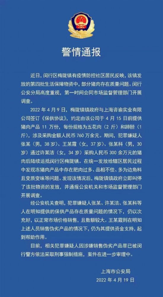 2022年4月9日,梅隴鎮鎮政府與上海咨諭實業有限公司簽訂《保供協議》,約定由該公司于4月15日前提供豬肉產品11萬份,每份規格為五花肉(2斤)和蹄髈(1斤),涉及采購金額人民幣760萬余元。期間,犯罪嫌疑人張某(男,38歲)、王某霞(女,37歲)、張某科(男,30歲)通過許某潔(女,34歲)采購人民幣300余萬元的豬肉后陸續運抵閔行區梅隴鎮。在統一發放給轄區居民過程中發現凍豬肉產品中存在肥肉過多、品相不佳、多為邊角料且變質變味等問題。發現該情況后,梅隴鎮鎮政府立即叫停了該批物資的發放,并通報公安機關和市場監督管理部門開展調查。