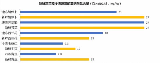 冷凍蔬菜和新鮮的亞硝酸鹽含量差不多,是因為亞硝酸鹽的升高需要依靠細菌,而冷凍蔬菜經過加工處理和低溫儲存,就像把蔬菜“凍齡”了一樣。