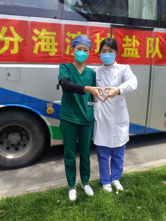 梁慧和姜蕾蕾一樣,在江蘇省鹽城市濱?h第一人民醫院腦外科任職護士。作為一名擁有8年黨齡的老黨員,在得知上海需要支援時,她毫不猶豫地在單位報名加入了江蘇省援滬醫療隊鹽城濱海分隊!拔抑辣砻靡言谝痪日夜奮戰了一個多月了,這一次,我們姐妹倆也算是一起并肩作戰了”,梁慧笑著說道。
