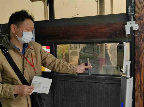 一早,便陸續有各村居志愿者來到城橋鎮社區衛生服務中心,為居民配取藥物。在入口處“數字哨兵”的終端前,志愿者打開碼對準掃碼口,“數字哨兵”當即播報了健康核驗結果,并顯示出來訪人員的體溫、核酸檢測等信息。整個過程無需工作人員引導輔助,高效便捷。