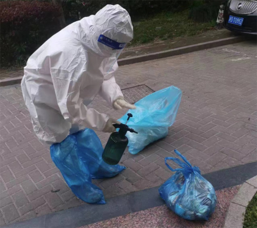 這是姜冰心成為垃圾上門收集志愿者的第一天,也是她平生第一次穿上防護服。天氣還算涼爽,姜冰心卻覺得又悶又熱,穿著防護服干活有些束手束腳,不一會兒,衣服就濕透了。盡管如此,她還是一絲不茍地按照作業要求規范地消殺和收集垃圾!叭绻l現堆放的垃圾無法處理的,要先進行消殺,并及時通過微信工作群上報!