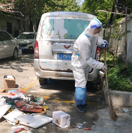 消殺,收集裝袋,再消殺,投放到小區垃圾廂房……4月16日早上9點,社會志愿者姜冰心穿戴好防護裝備,準時在廣中路街道花園城小區上崗。
